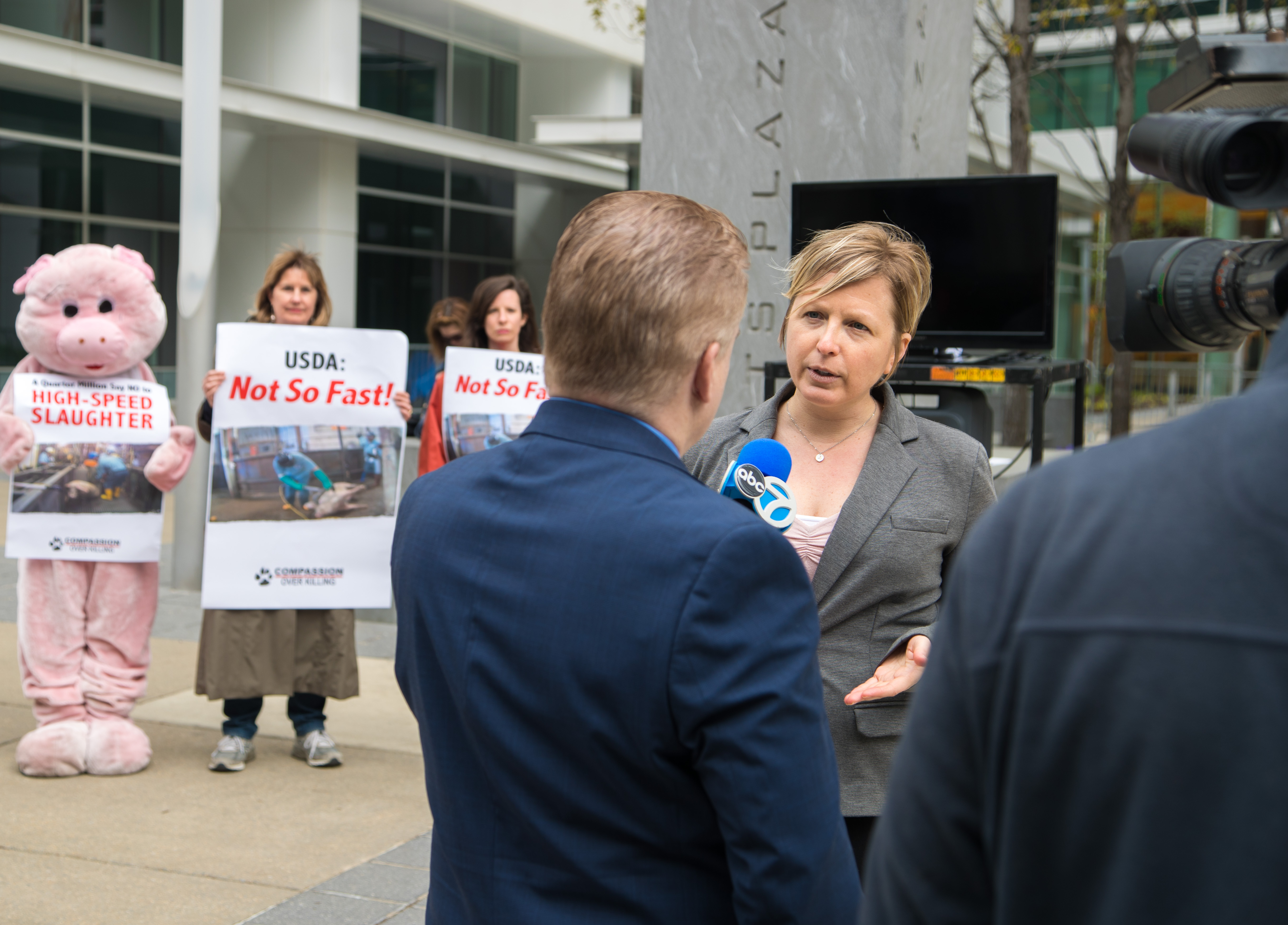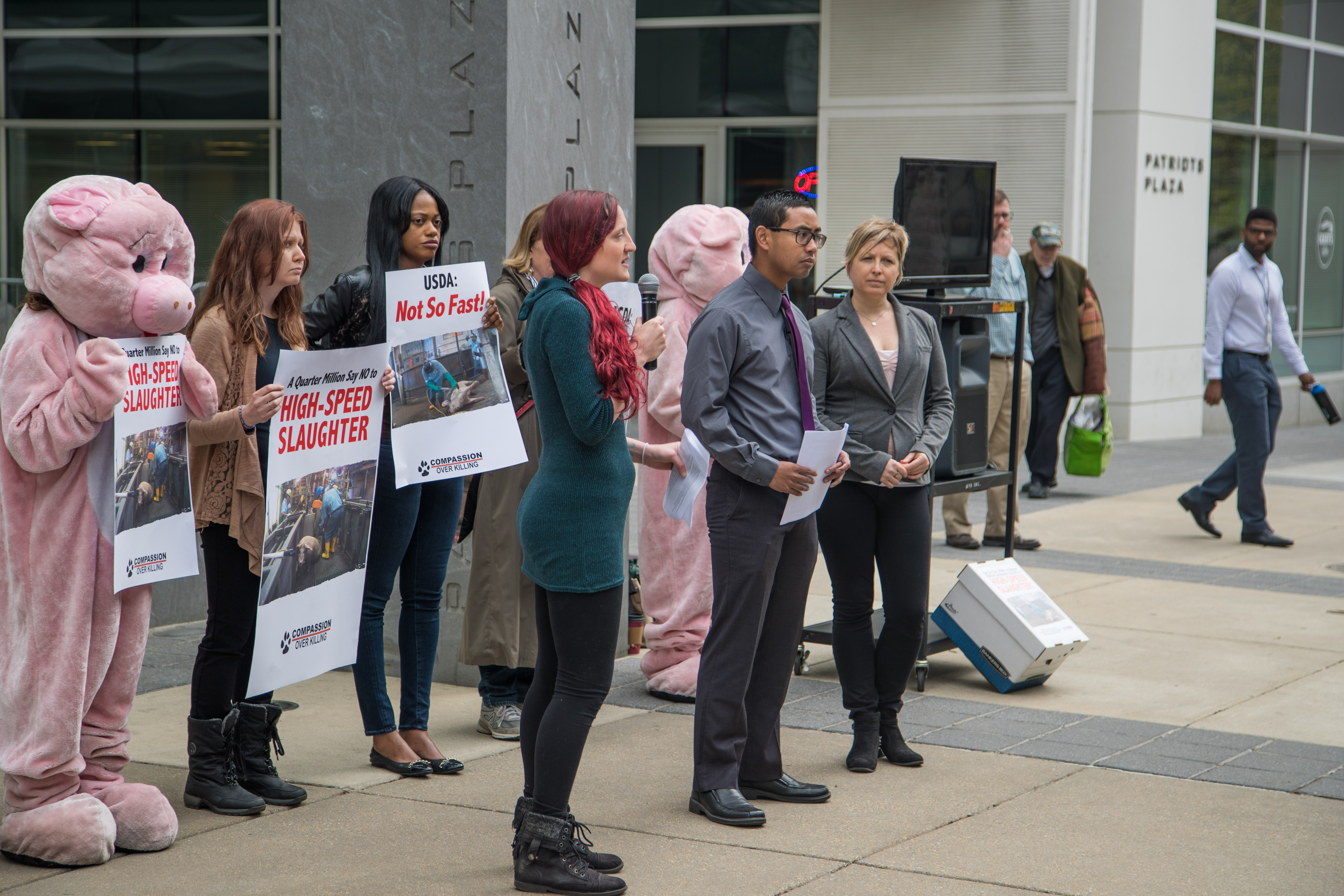 Washington, DC — April 24, 2018 — Today, Compassion Over Killing (COK) brought media and the voices of over a quarter million people to the doorstep of the US Dept. of Agriculture (USDA) in the nation’s capital, in a rally against the expansion of the federal agency’s dangerous high-speed pig slaughter program.